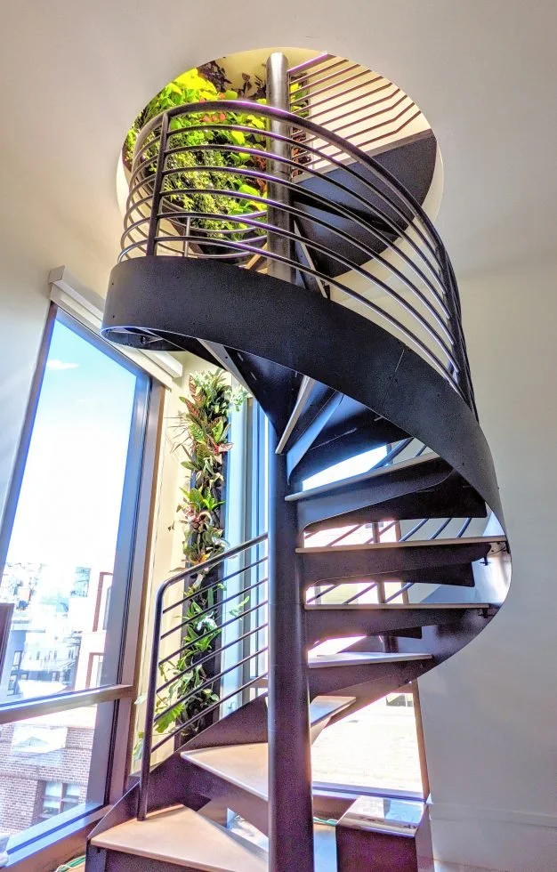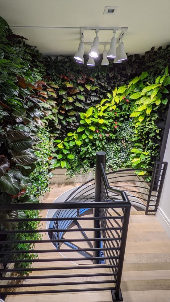 Discover the ultimate living wall experience on two floors as you ascend the grand spiral staircase to a tropical wonderland. Tucked away in a private San Francisco penthouse this exotic living wall installation was created by Chris Bribach of Plants On Walls using the Florafelt Pocket Panel living wall system. High power LED lights create an artificial sun that delivers a fresh feeling to this urban hideaway.